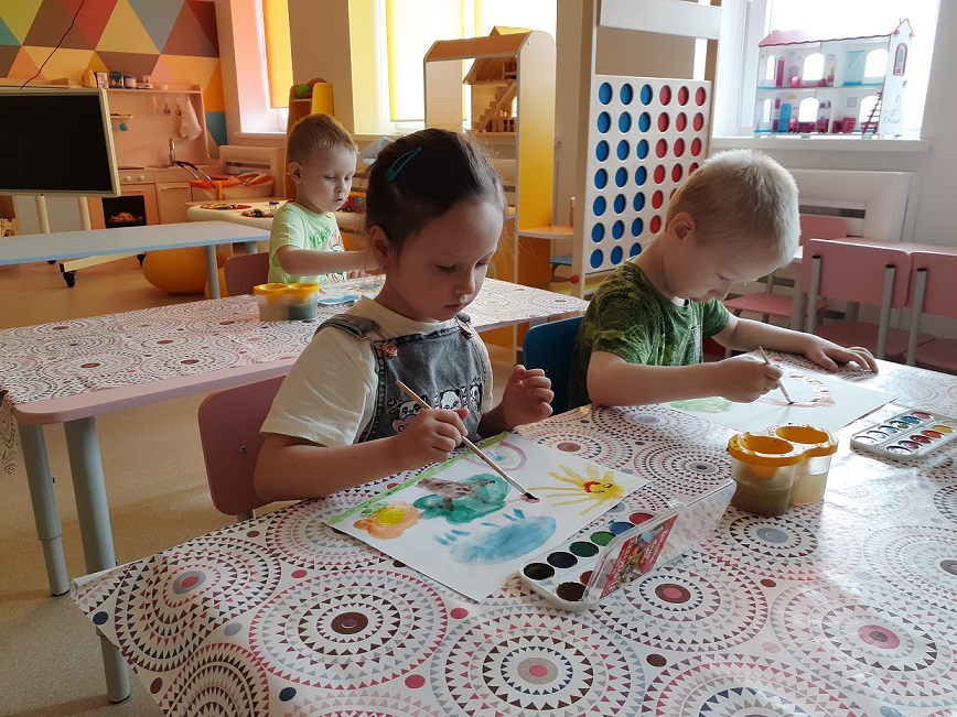В рамках недели «Здравствуй лето» с детьми проводились беседы: « О сезонных изменениях в природе», «Признаки лета». Во время прогулки дети наблюдали за изменениями в живой природе. Ребята закрепили полученные знания на занятиях по лепке создав композицию «Цветочная поляна». И на занятии по рисованию нарисовав «Летнюю картину». Так же на занятии по аппликации дети обводили ладошки и свои фантазии обсудив передали с помощью самоклеящейся бумаги создав коллективную работу «Лето».