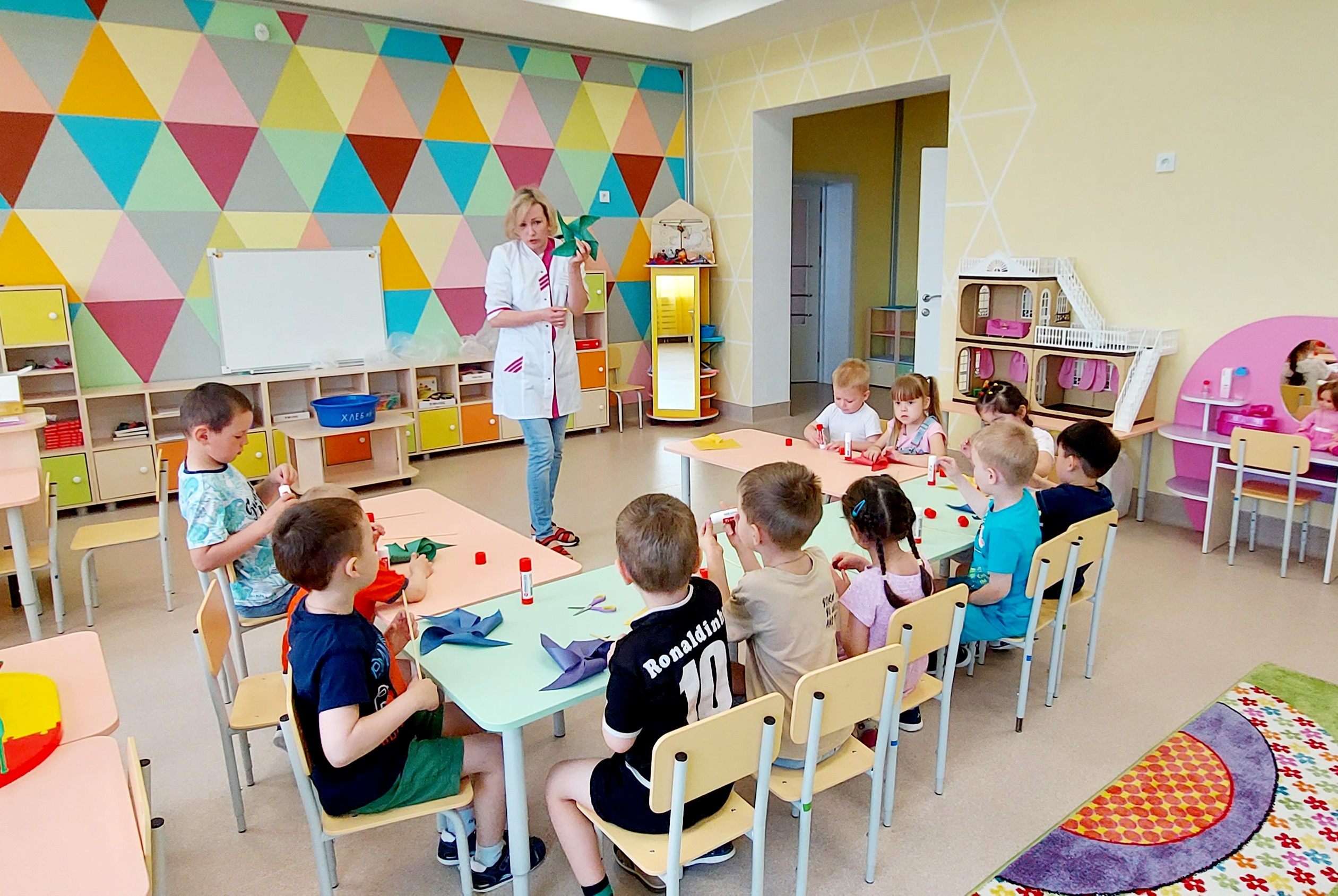 Провели опыты и эксперименты с ветром и воздухом. Дети становились «ветрами» в игре – соревновании «Кто быстрее переправит кораблик с одного берега на другой» с помощью силы воздушной струи. В завершении развлечений дети выполнили конструирование из бумаги «Вертушка».