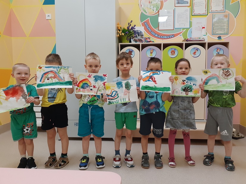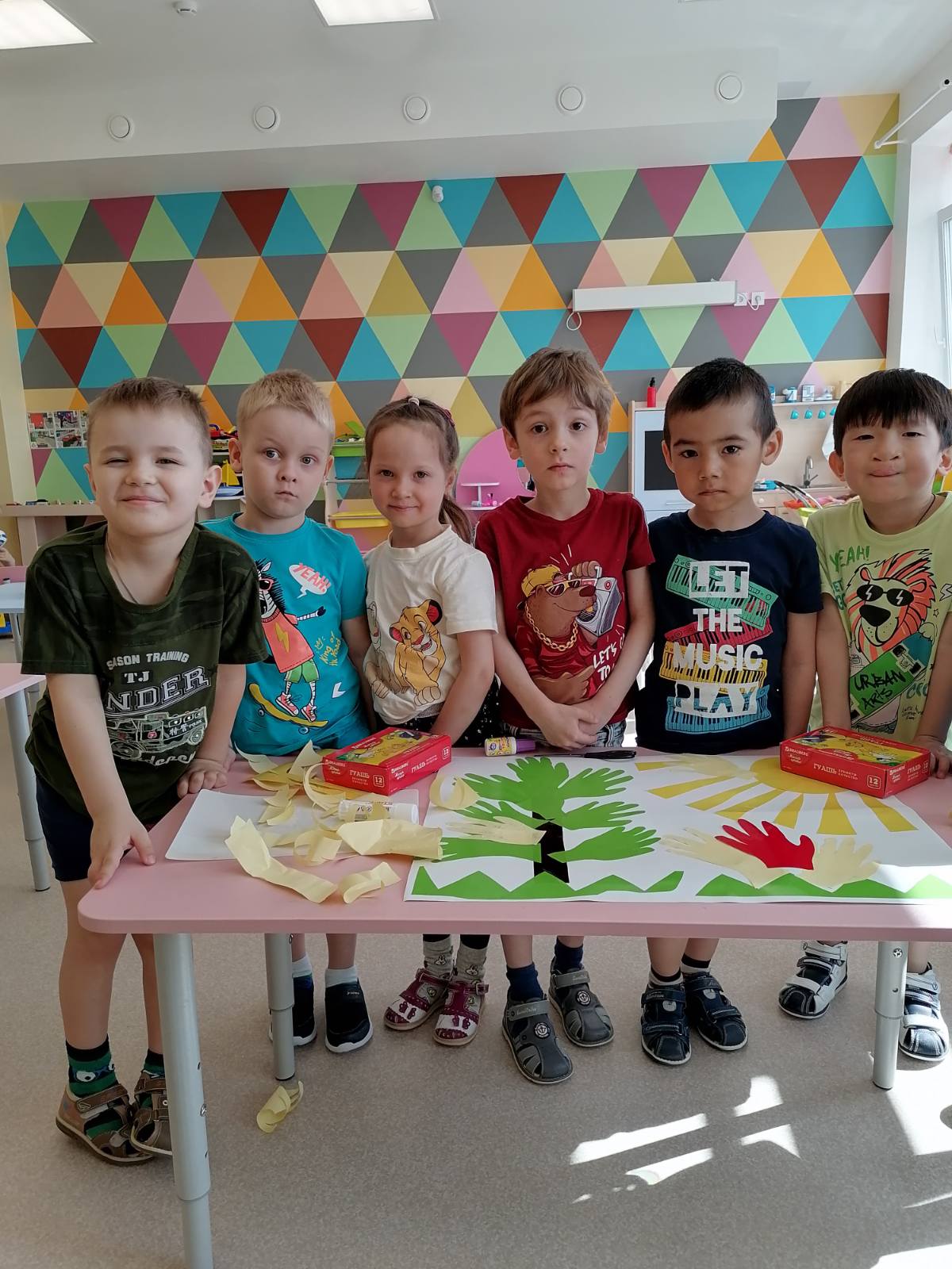В рамках недели «Здравствуй лето» с детьми проводились беседы: « О сезонных изменениях в природе», «Признаки лета». Во время прогулки дети наблюдали за изменениями в живой природе. Ребята закрепили полученные знания на занятиях по лепке создав композицию «Цветочная поляна». И на занятии по рисованию нарисовав «Летнюю картину». Так же на занятии по аппликации дети обводили ладошки и свои фантазии обсудив передали с помощью самоклеящейся бумаги создав коллективную работу «Лето».