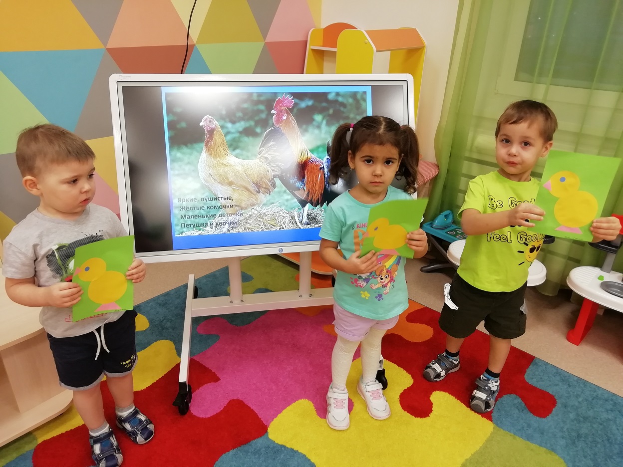 В группе «Радуга» прошло занятие по экологическому воспитанию по теме «Знакомство с куриным семейством». На котором дети получили первоначальное представления о составе куриной семьи (петух, курица с цыплятами), их внешних отличиях: петух большой, у него на голове гребешок, бородка, у него пышный круглый хвост , яркое оперение, курица большая, но хвост и гребешок на голове у нее меньше, чем у петуха, петух –папа, курица-мама, у них есть детки цыплята, они маленькие круглые, пушистые бегают за курицей, прячутся под ее крыло. Дети учились определять на картинках и в игрушечном изображении петуха, курицу, цыплят. Поиграли в музыкальную игру «Вышла курочка гулять», а затем изготовили своих замечательных цыплят.