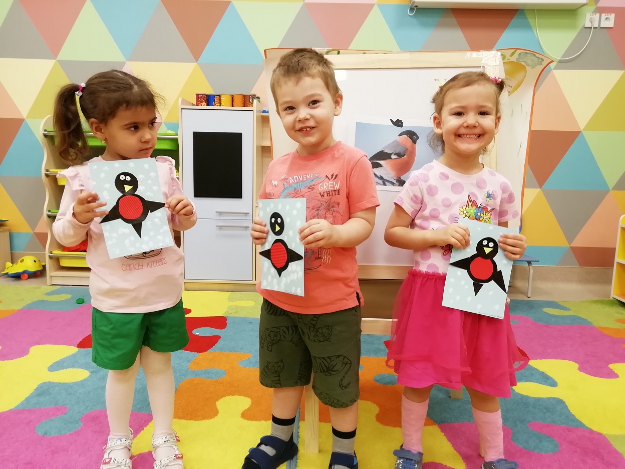 В группе «Радуга прошло занятие по художественно- эстетическому творчеству (аппликация),на котором дети познакомились с зимующей птицей – снегирь. С детьми была проведена беседа о внешнем виде птицы. Красногрудый снегирь является спутником бабушки-зимы и снега: недаром же он и назван снегирем. Снегирь размером чуть крупнее домового воробья. Окраска самца снегиря незабываемая, в первую очередь, благодаря ярко-алому цвету брюха. На голове шапочка черного цвета. Спина и плечи серые. Хвост и крылья иссиня-черной с металлическим отливом окраски. Познакомились, чем питаются птички. Кормом снегирям служат различные ягоды семена, почки, также отмечено питание некоторыми паукообразными. Места кормежек снегирей можно увидеть – эти птицы, выедая семена ягод, мякоть бросают на землю.