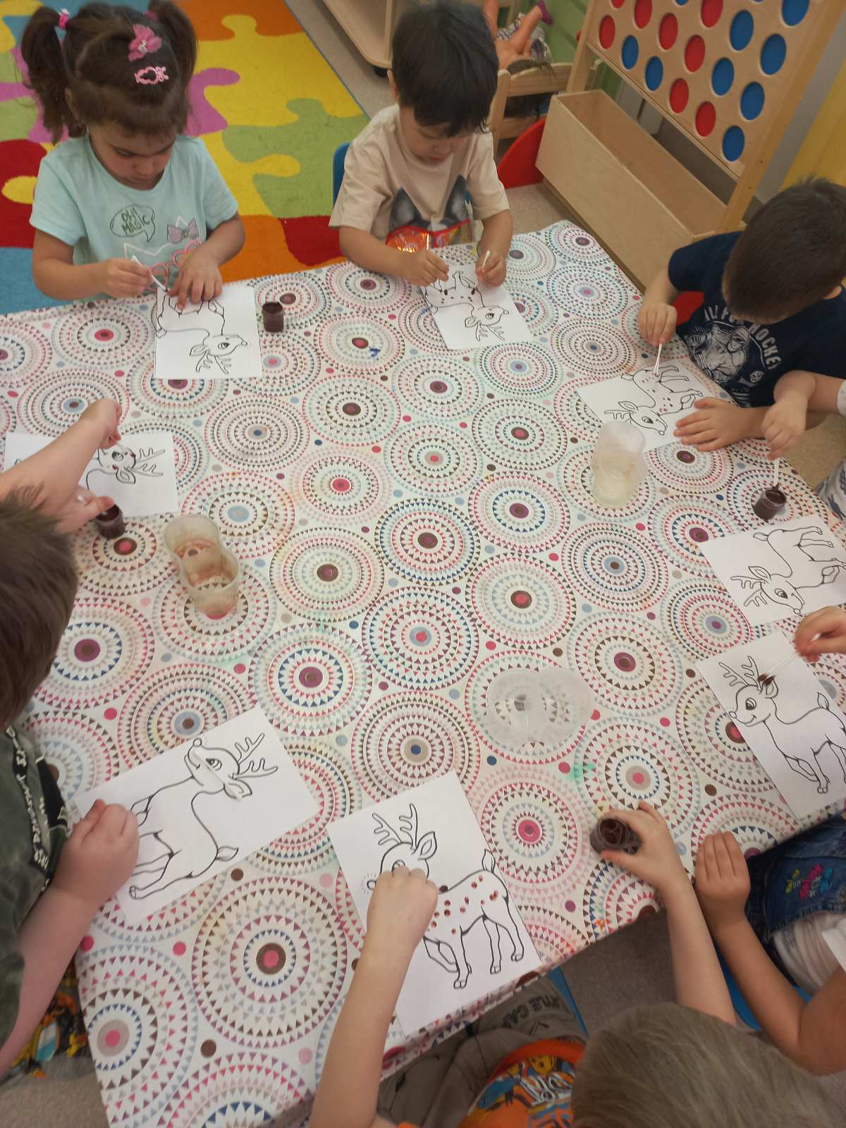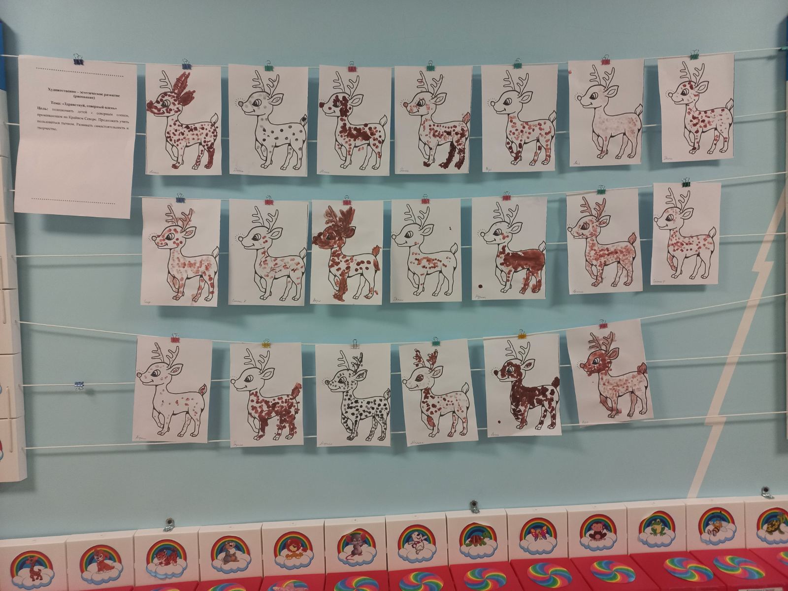 В начале занятия педагог закрепила знания детей в названии животных, которые живут в лесу. Затем познакомила ребят со зверем, который тоже живет в лесу – это северный олень. Ребята послушали стихотворение о лесных животных Е.Алябьевой и рассказ-описание о северном олене. Ответили на вопросы воспитателя: «что находится на голове оленя?», «какие у оленя рога, шерстка, хвостик?». В основной части занятия ребятам было предложено методом «тычкования» украсить маленьких оленят. В заключительной части занятия у ребят получились красивые и замечательные олени. Ребята проявили интерес к данному занятию.