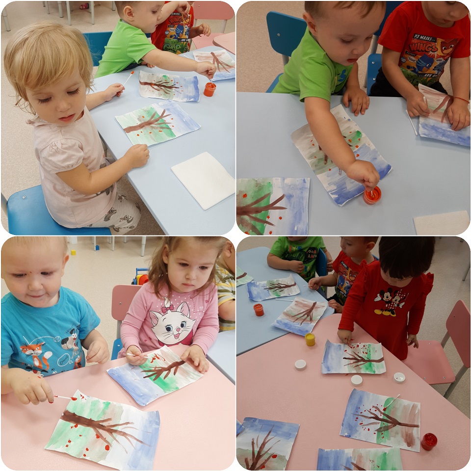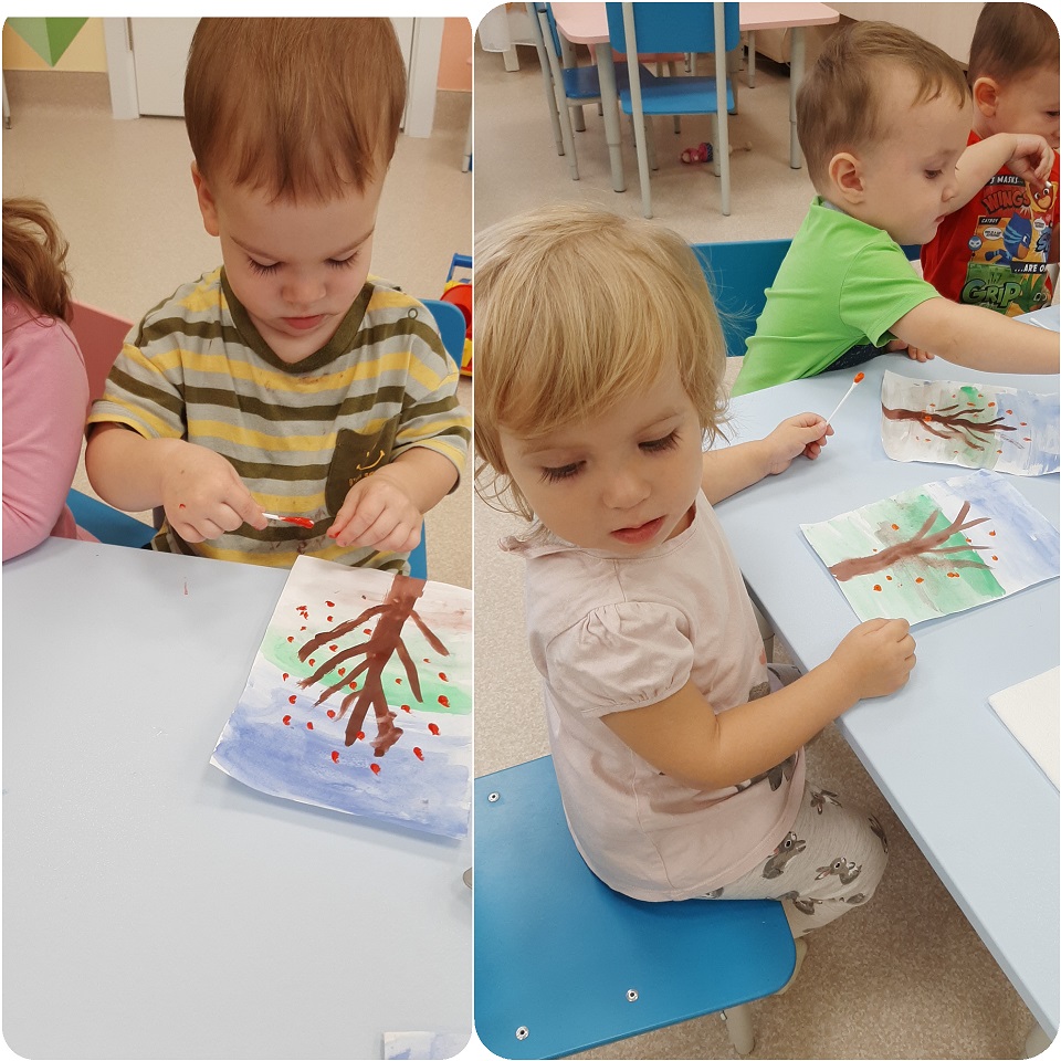 Цель: Формирование умения детей рисовать нетрадиционным способом – ватными палочками, используя краски. 1. Учить рисовать точки («листочки») на веточках деревьев. 2. Закреплять знание основных цветов. 3. Создать радостное настроение.