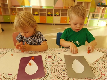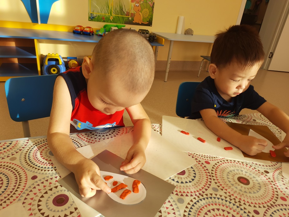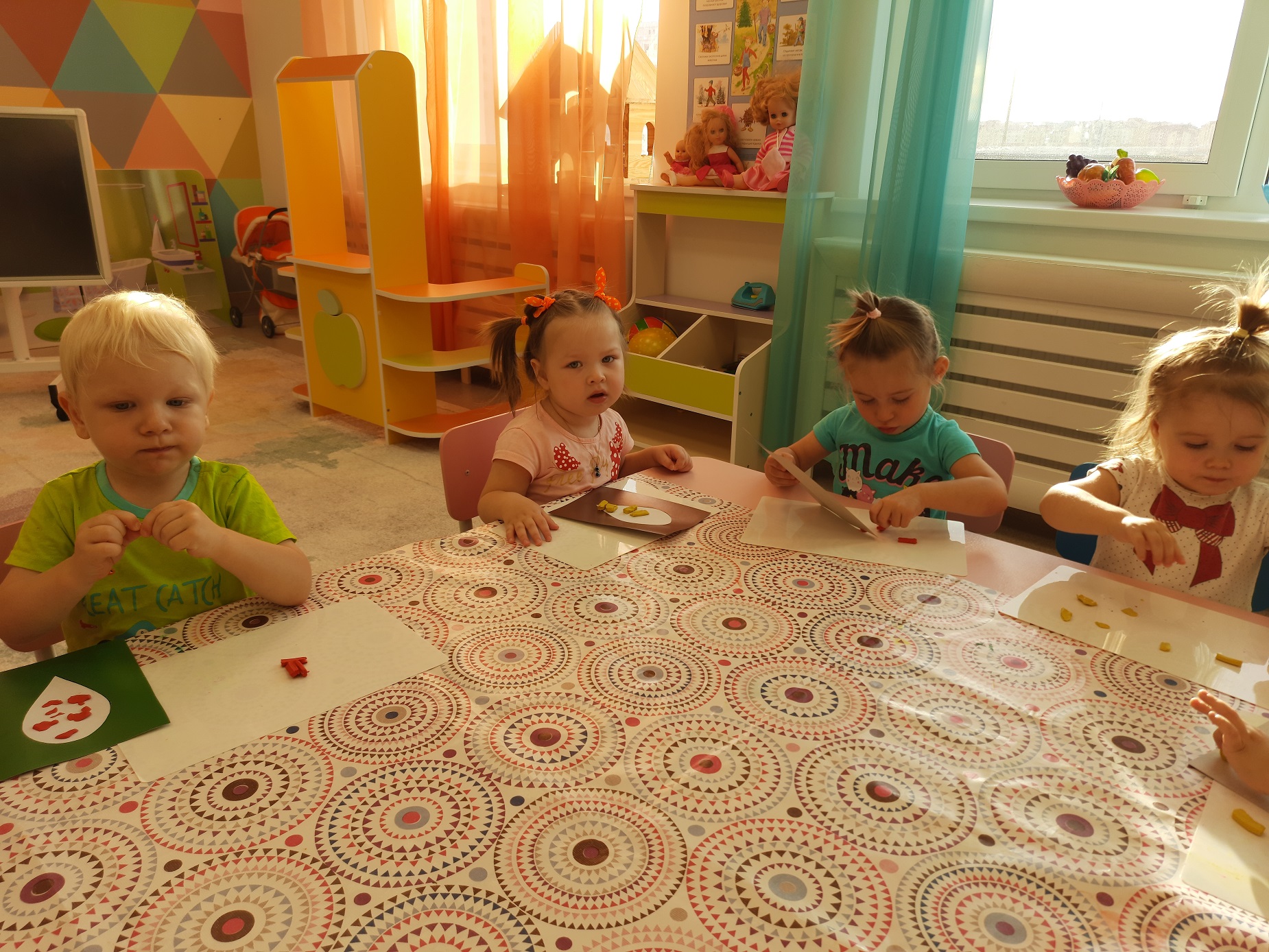продолжать учить отщипывать небольшие кусочки пластилина и скатывать маленькие шарики. Формировать умения расплющивать шарики на всей поверхности листа.