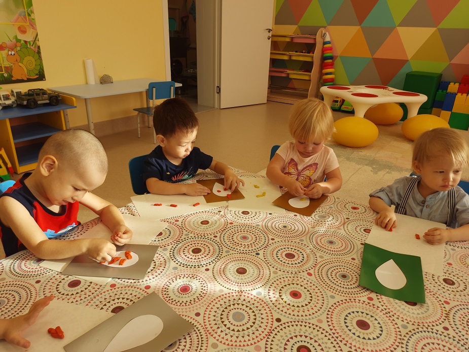 продолжать учить отщипывать небольшие кусочки пластилина и скатывать маленькие шарики. Формировать умения расплющивать шарики на всей поверхности листа.