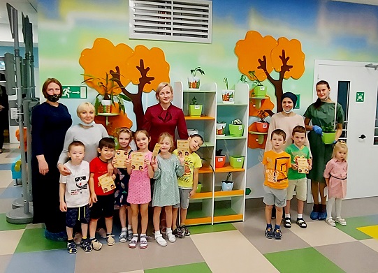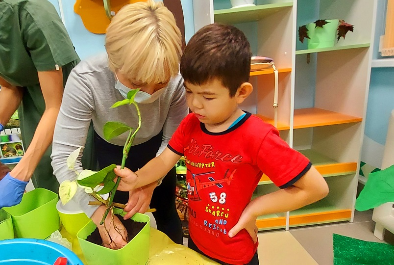 С большим интересом и радостью дети вместе с родителями сажали различные виды цветов, а затем разместили на экологических полках каждого этажа. Далее ребята будут продолжать за ними ухаживать, поливать и следить за их ростом.