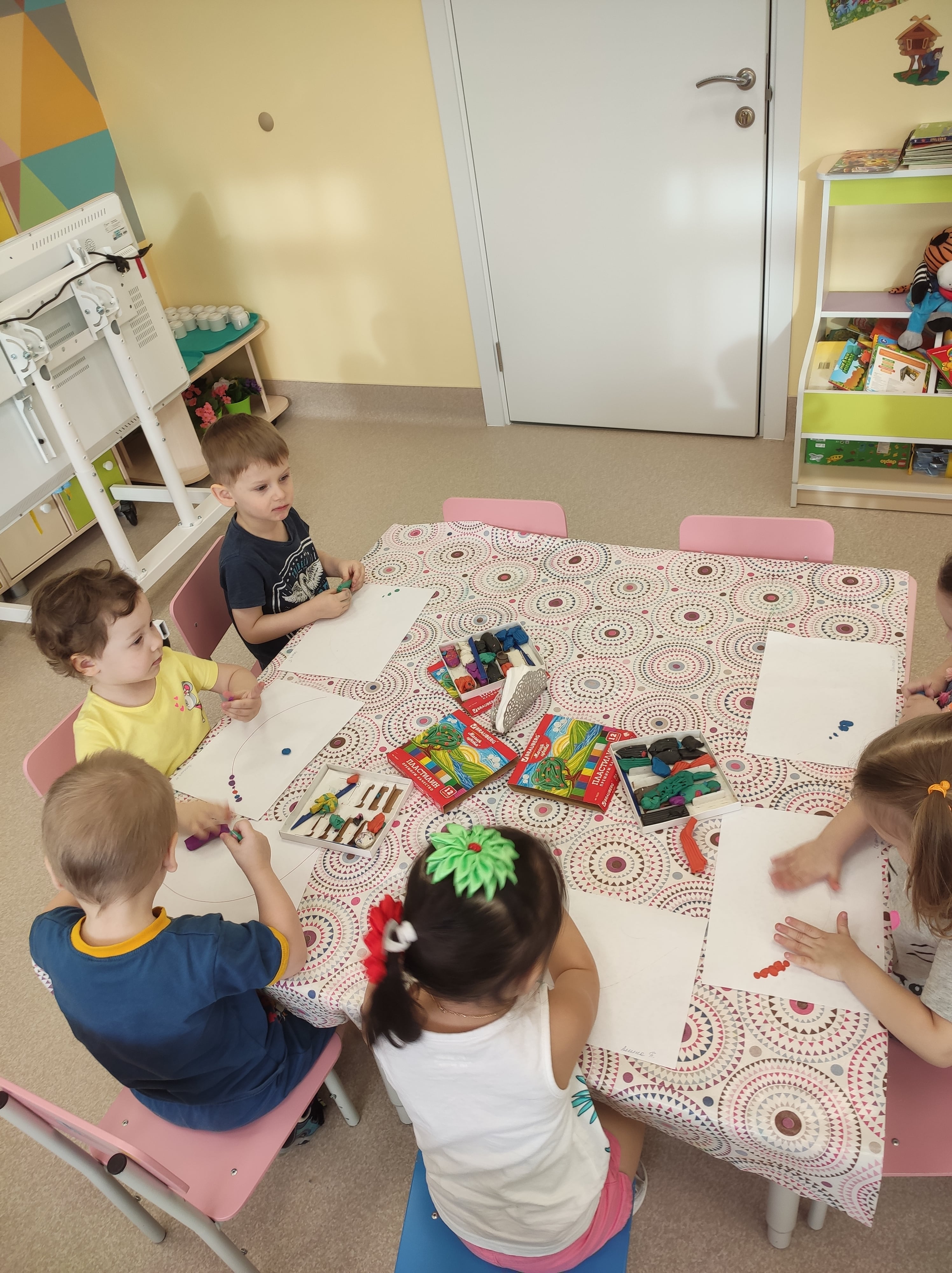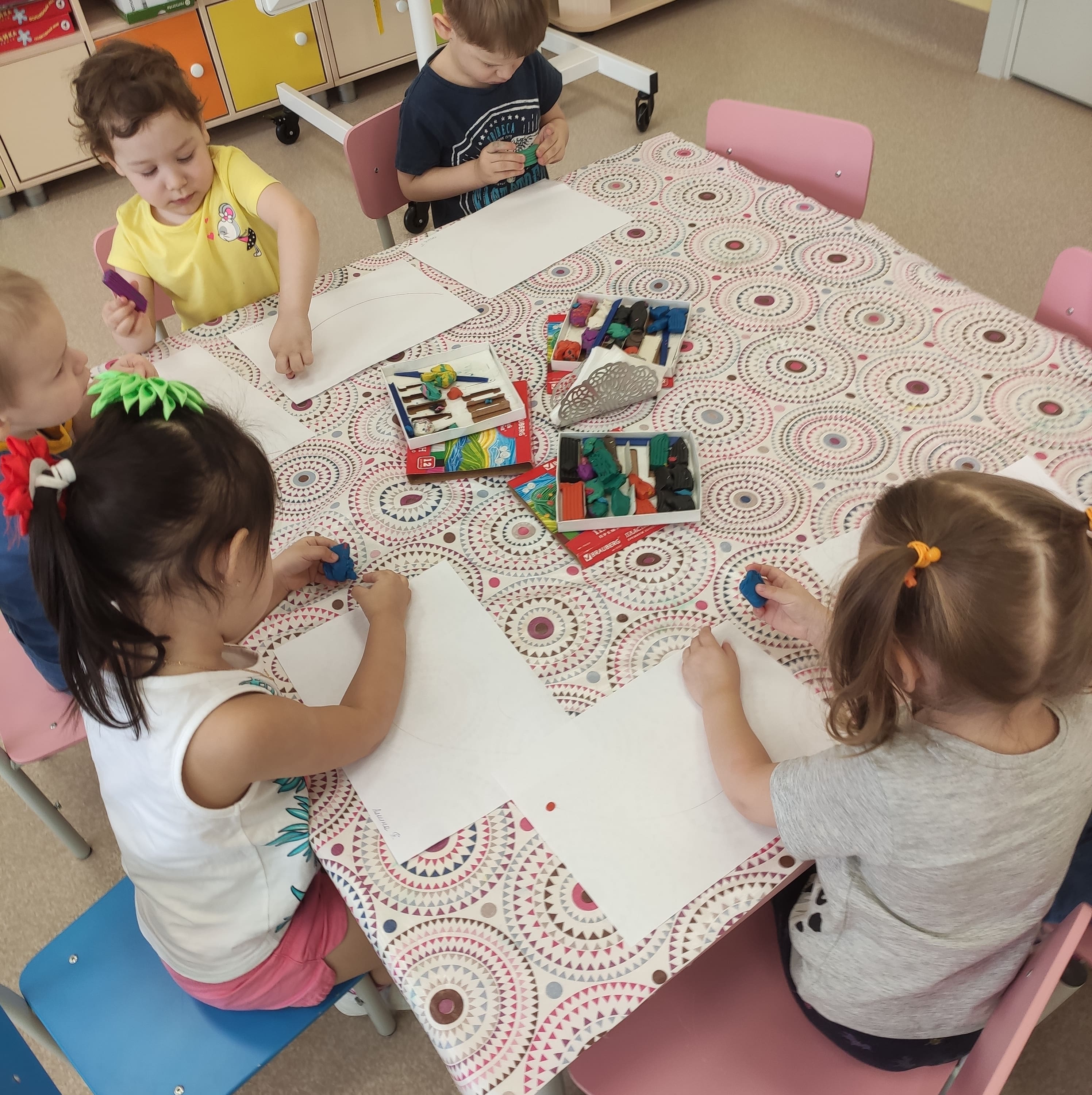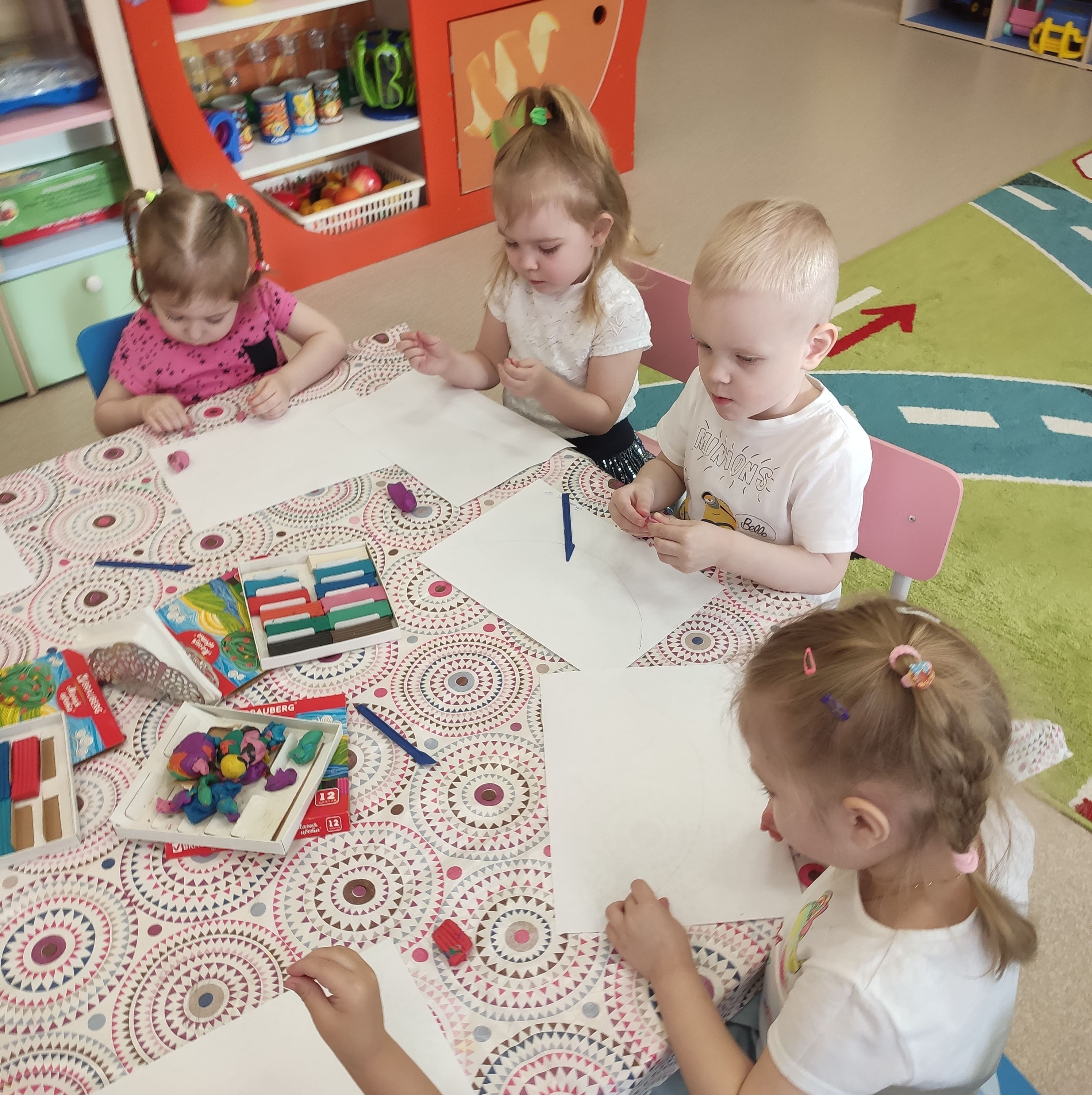 Цель: продолжать учить детей отрывать маленькие кусочки пластилина, скатывать их между ладоней и расплющивать пальцем сверху. Развивать мелкую моторику рук. Развивать творческие способности, мышление.