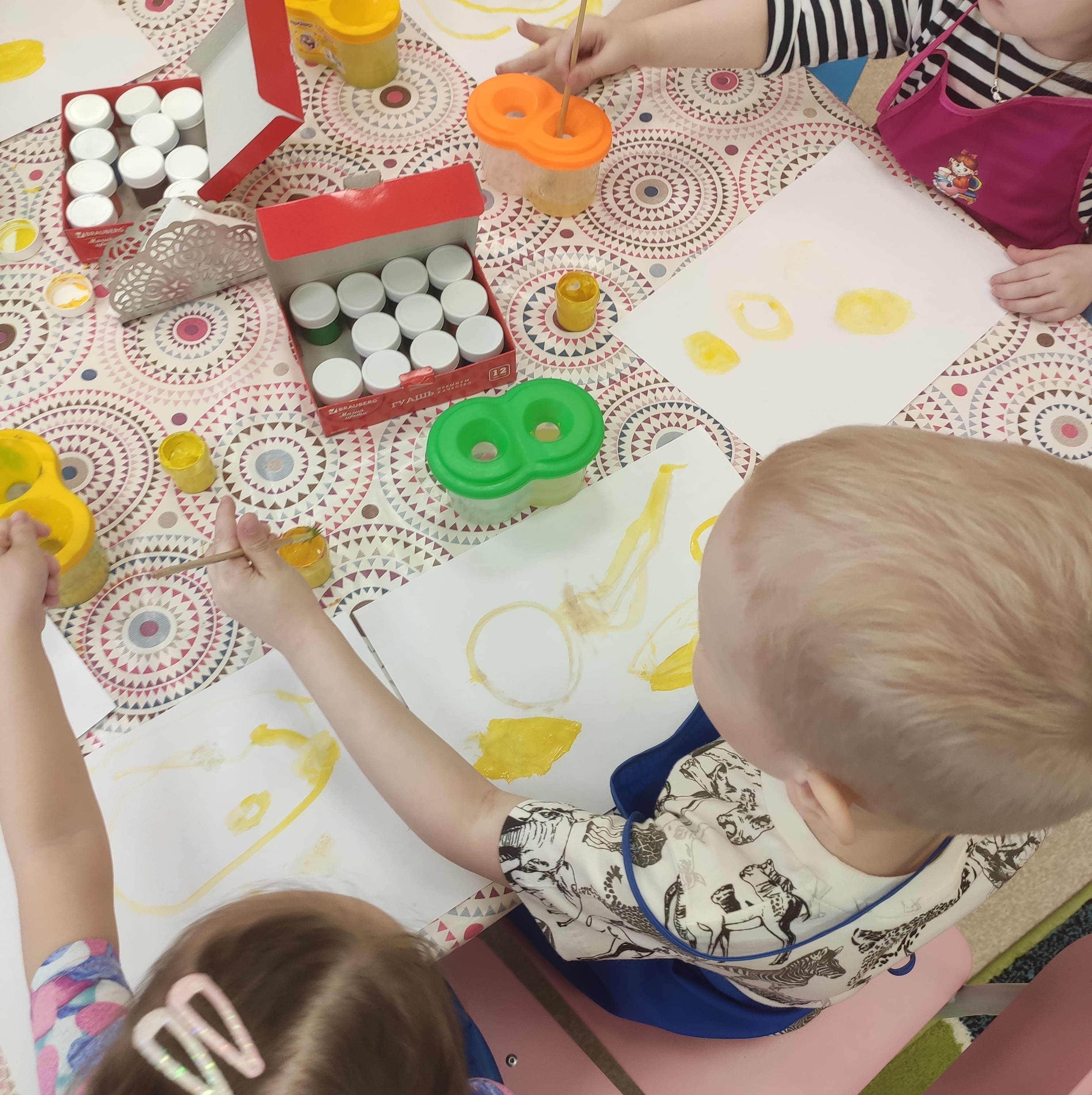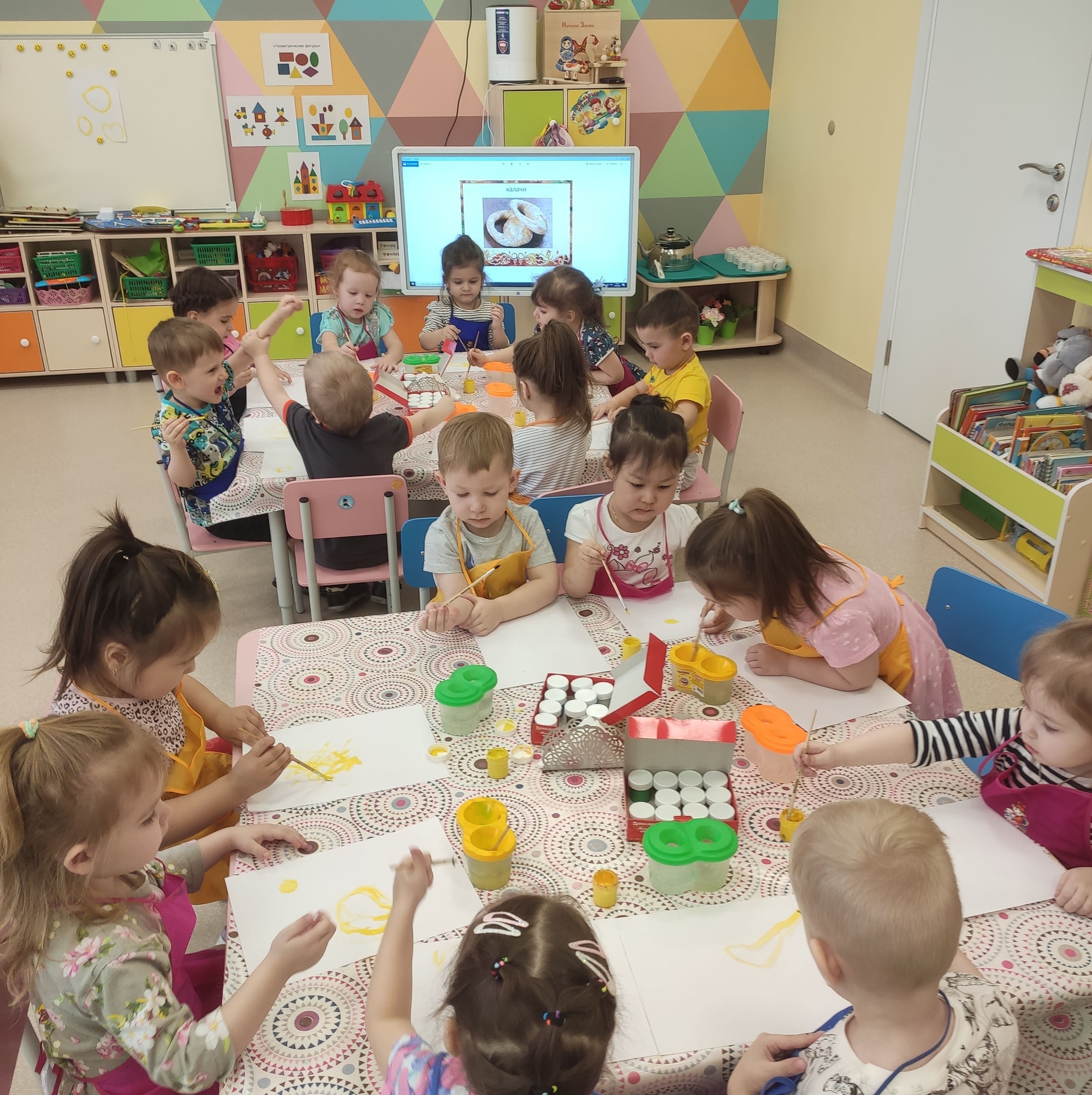 Цель: вызвать у детей интерес к рисованию бубликов – баранок. Формировать умение рисовать круг – замыкать линию в кольцо. Совершенствовать навык рисования кистью закрепить технику и правила (секреты) пользования кистью: правильно держать пальцами, смачивать ворс, набирать краску только на ворс, вести по ворсу, промывать, просушивать, не оставлять в банке с водой.