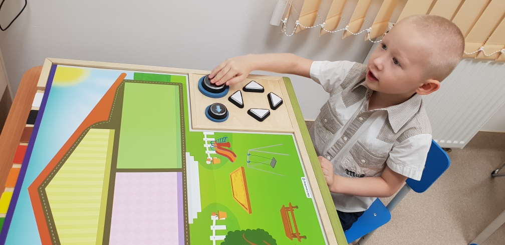 · Рабочая панель - оснащена сменными ковриками и двумя пультами управления с большими кнопками; Здесь дети развивают пространственную ориентацию (повторяют направление: вверх, вниз, лево, право) и также развивают мелкую моторику;