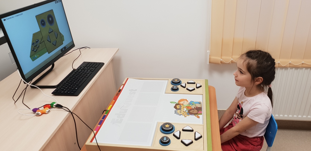 Занятия по Эдуквест проходят индивидуально. Дети работают как на рабочей панели с помощью кнопок, так и на интерактивной доске с помощью стилуса или с помощью руки.