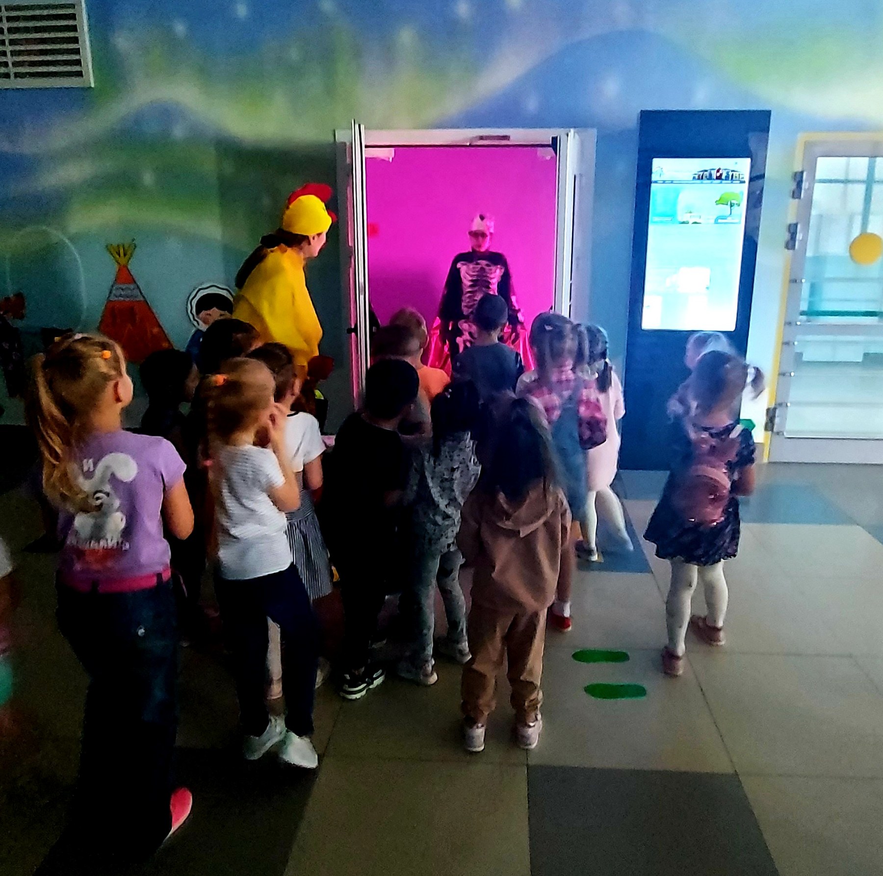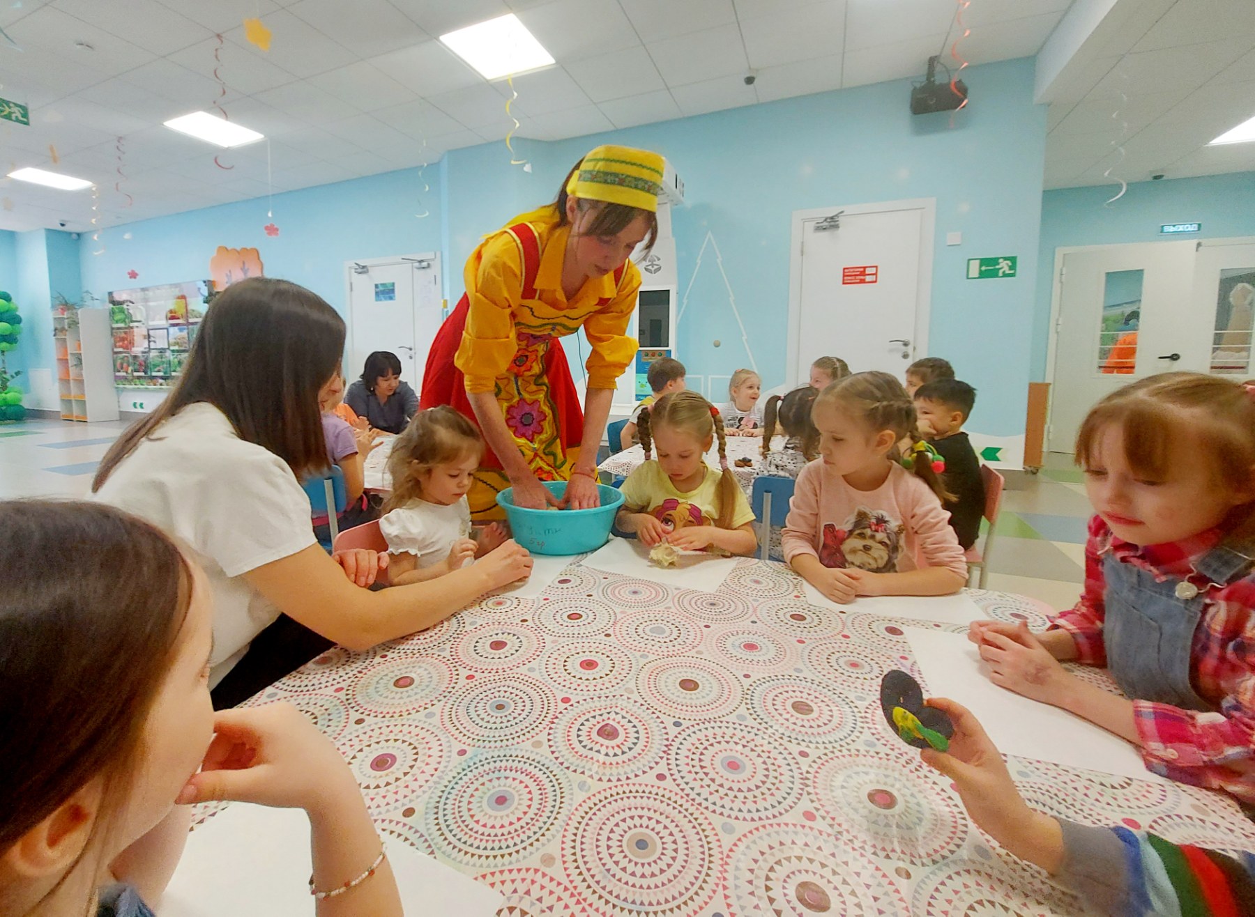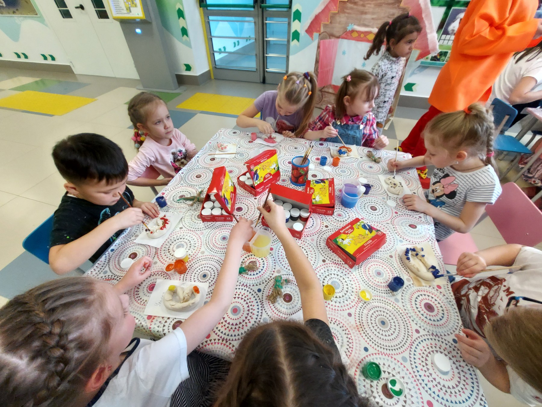 Далее, Аленушка с детьми пекли волшебные каралики, а потом и разукрашивали их. Так же с Марьей Искусницей изготовили куклу из ниток. Побывали в пещере злого Кощея, играя с ним в очень интересную игру под названием «Продавец красок». Выполняя все задания, ребята попали к Бабе Яге. Она с ребятами плясала, играла и смотрела с ними на большом экране мультфильм.