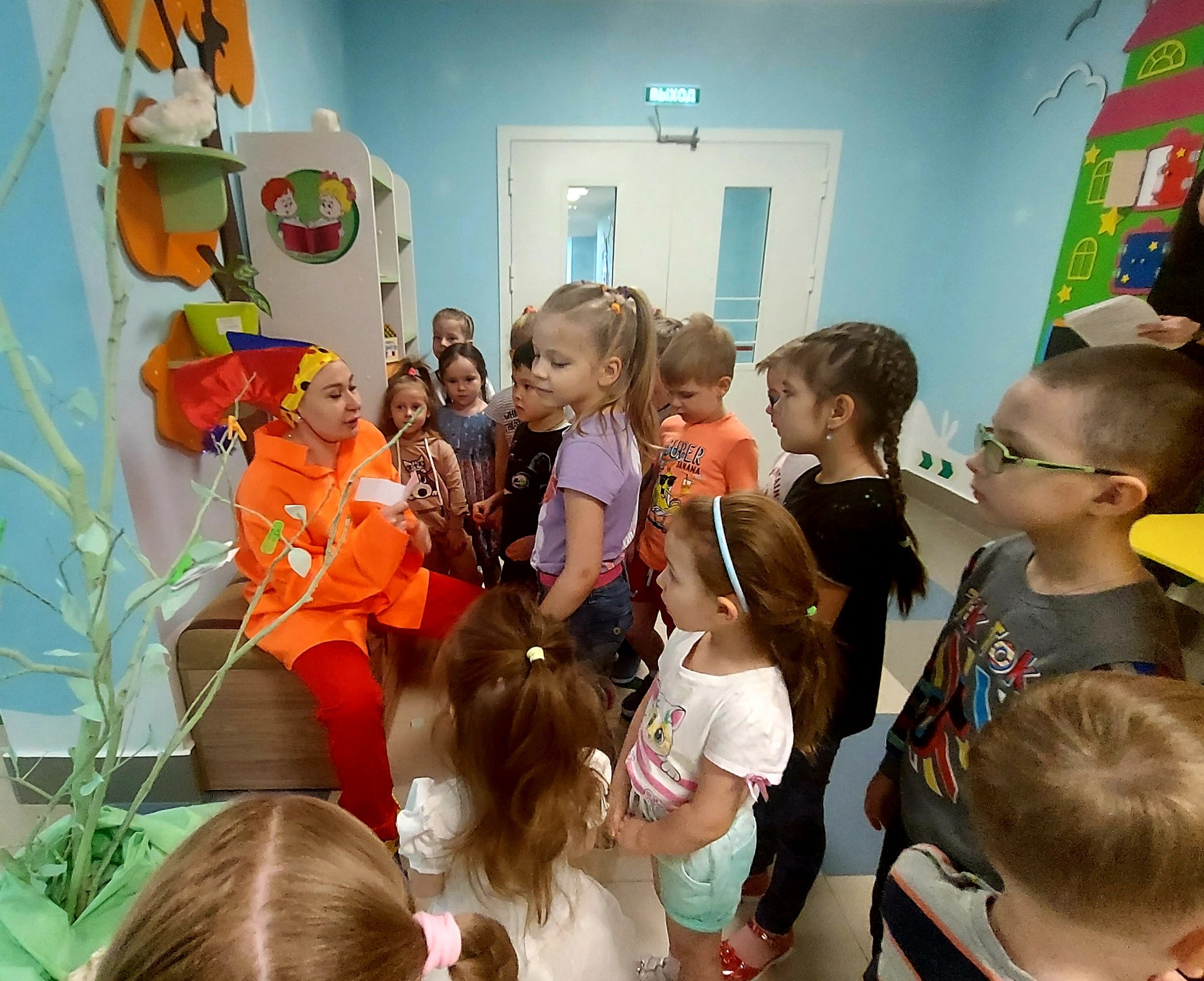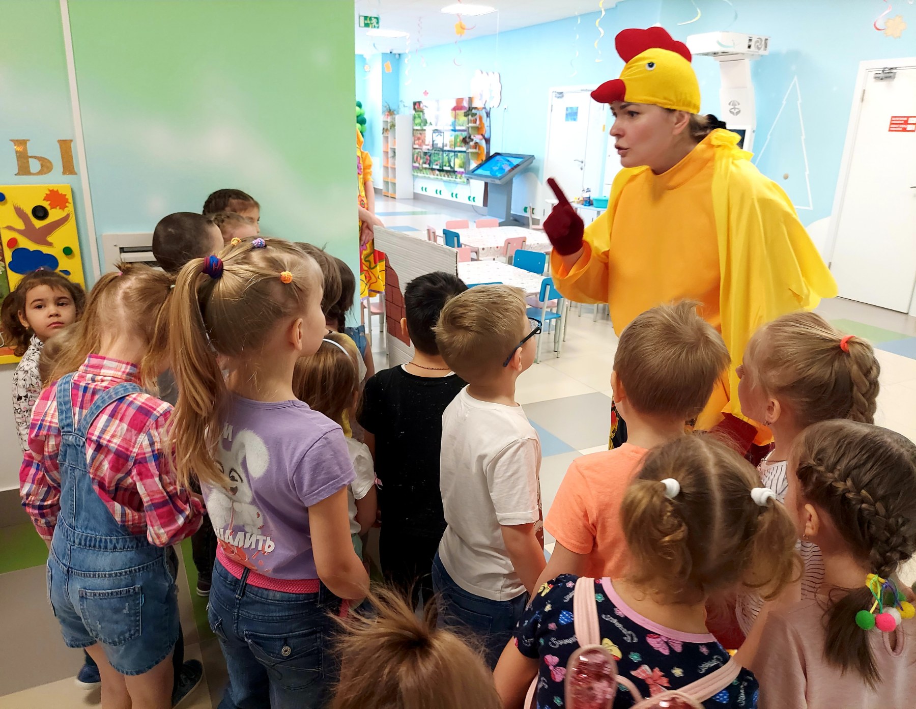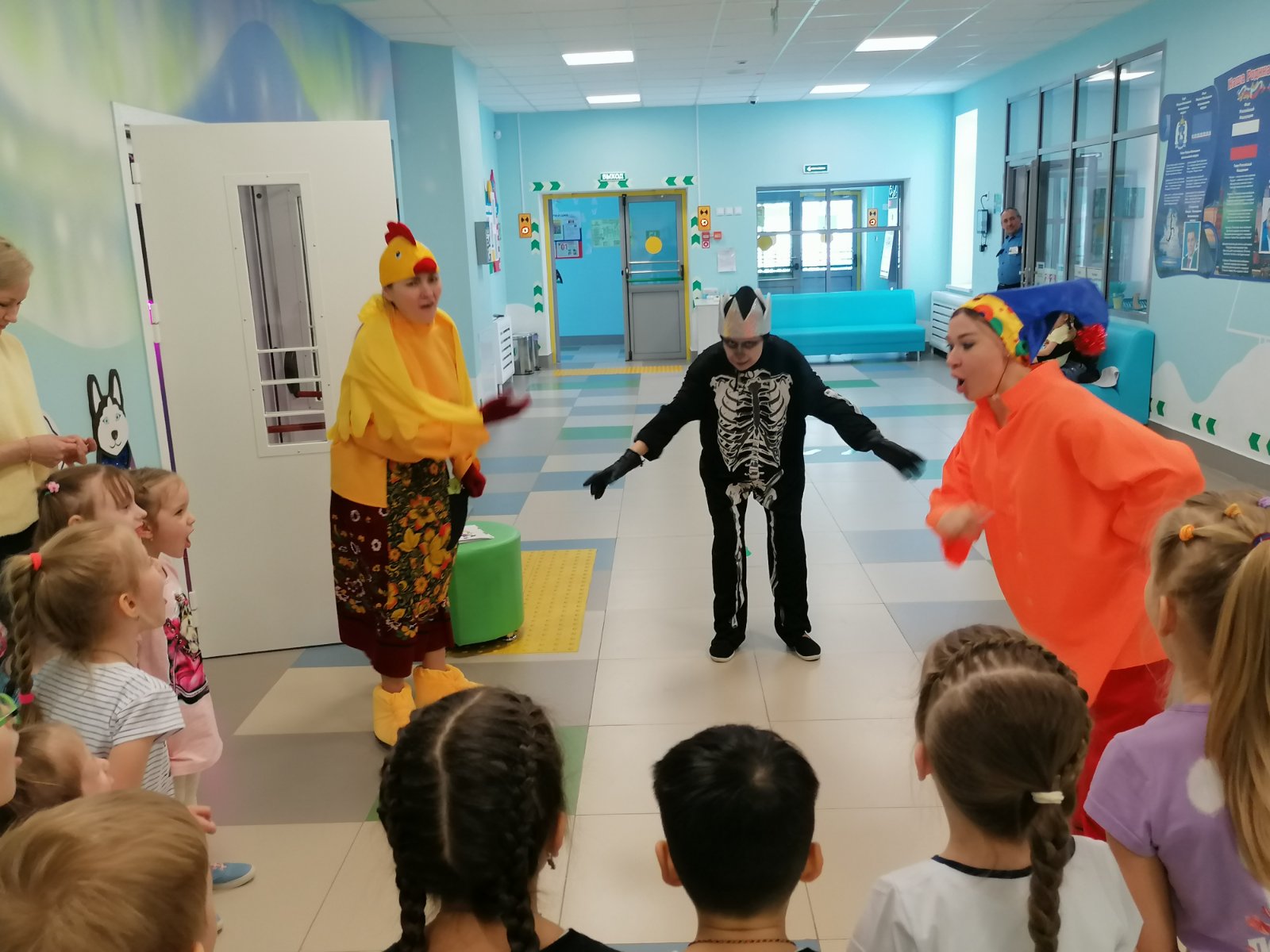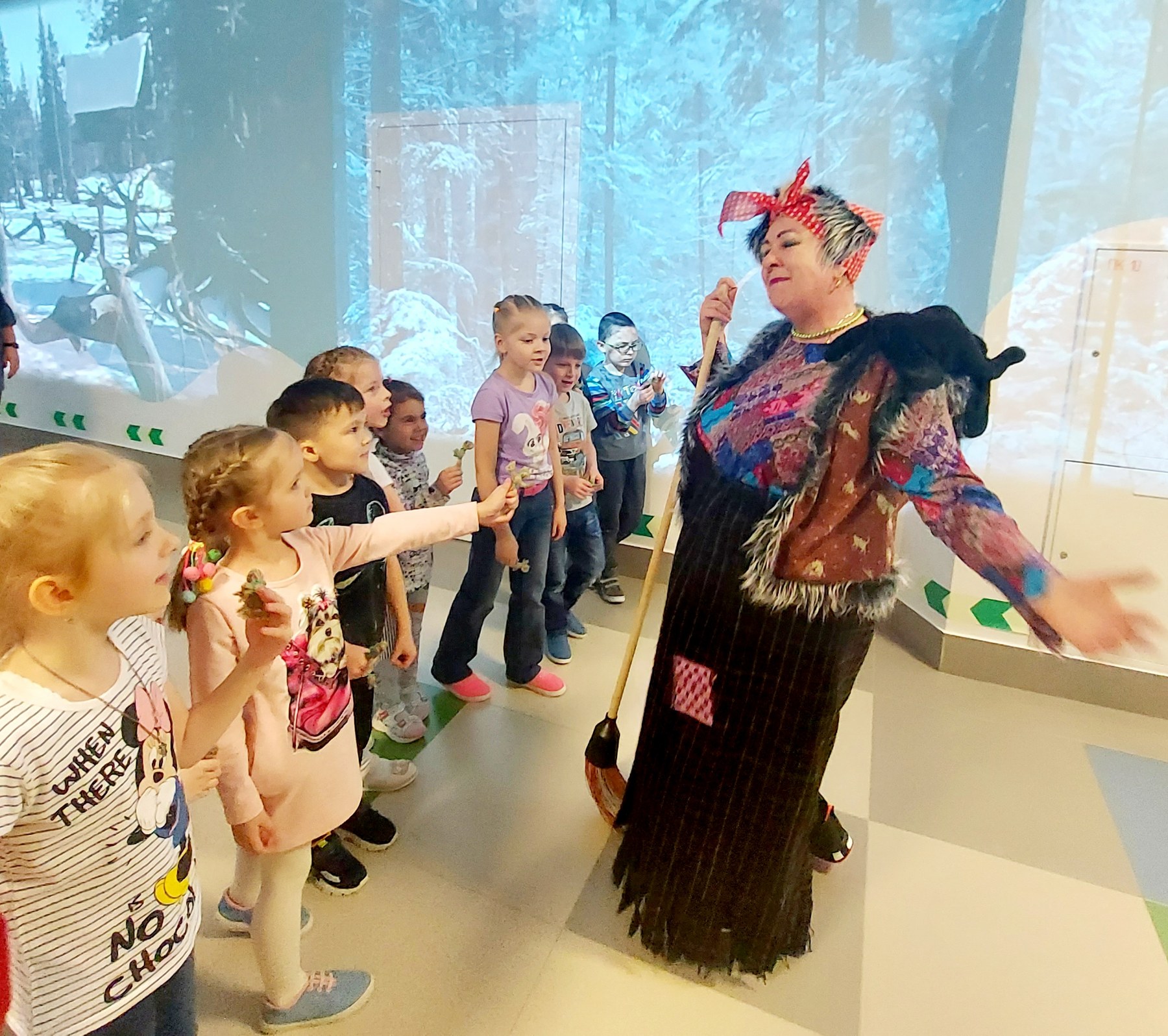 Далее, Аленушка с детьми пекли волшебные каралики, а потом и разукрашивали их. Так же с Марьей Искусницей изготовили куклу из ниток. Побывали в пещере злого Кощея, играя с ним в очень интересную игру под названием «Продавец красок». Выполняя все задания, ребята попали к Бабе Яге. Она с ребятами плясала, играла и смотрела с ними на большом экране мультфильм.