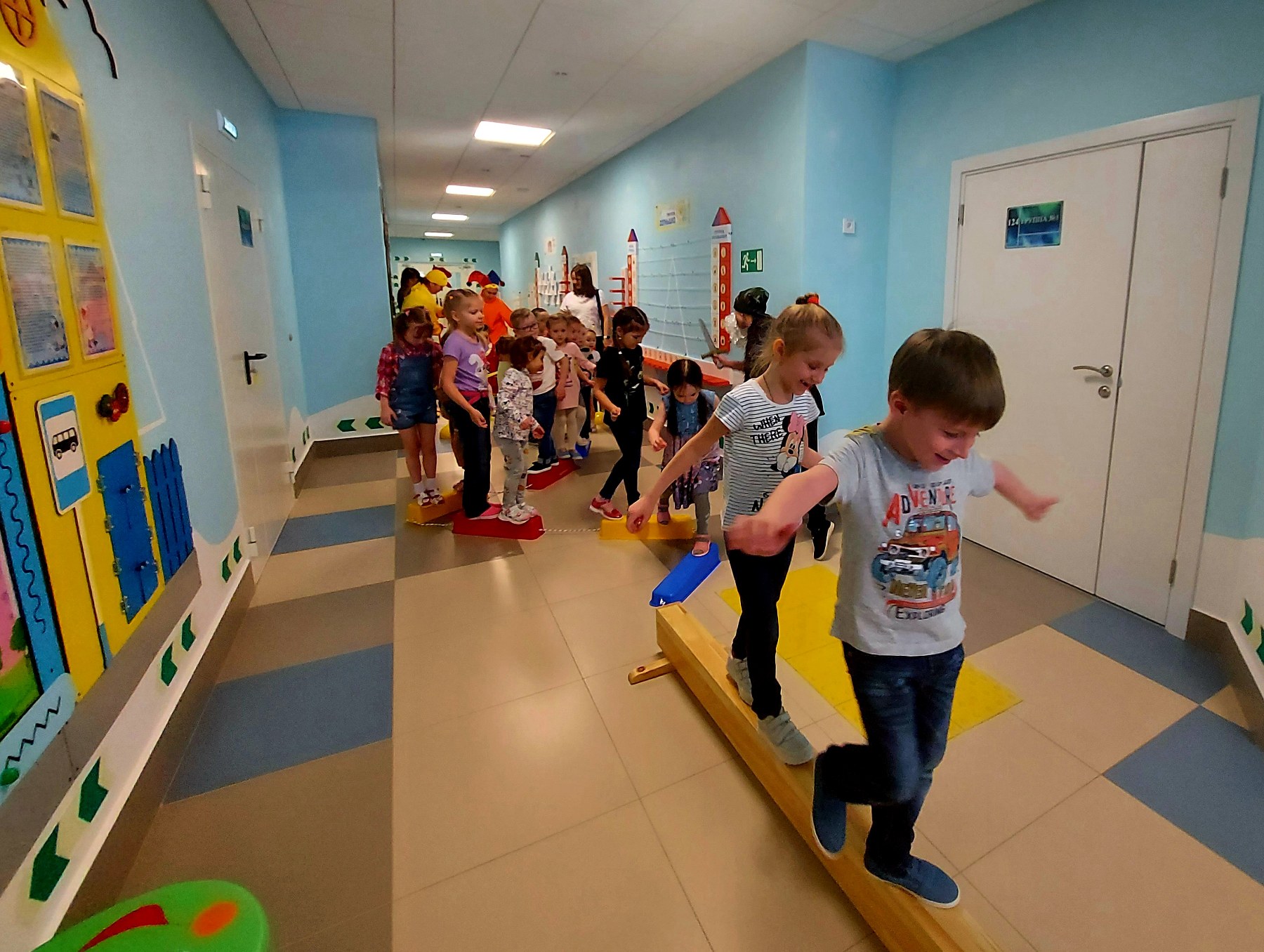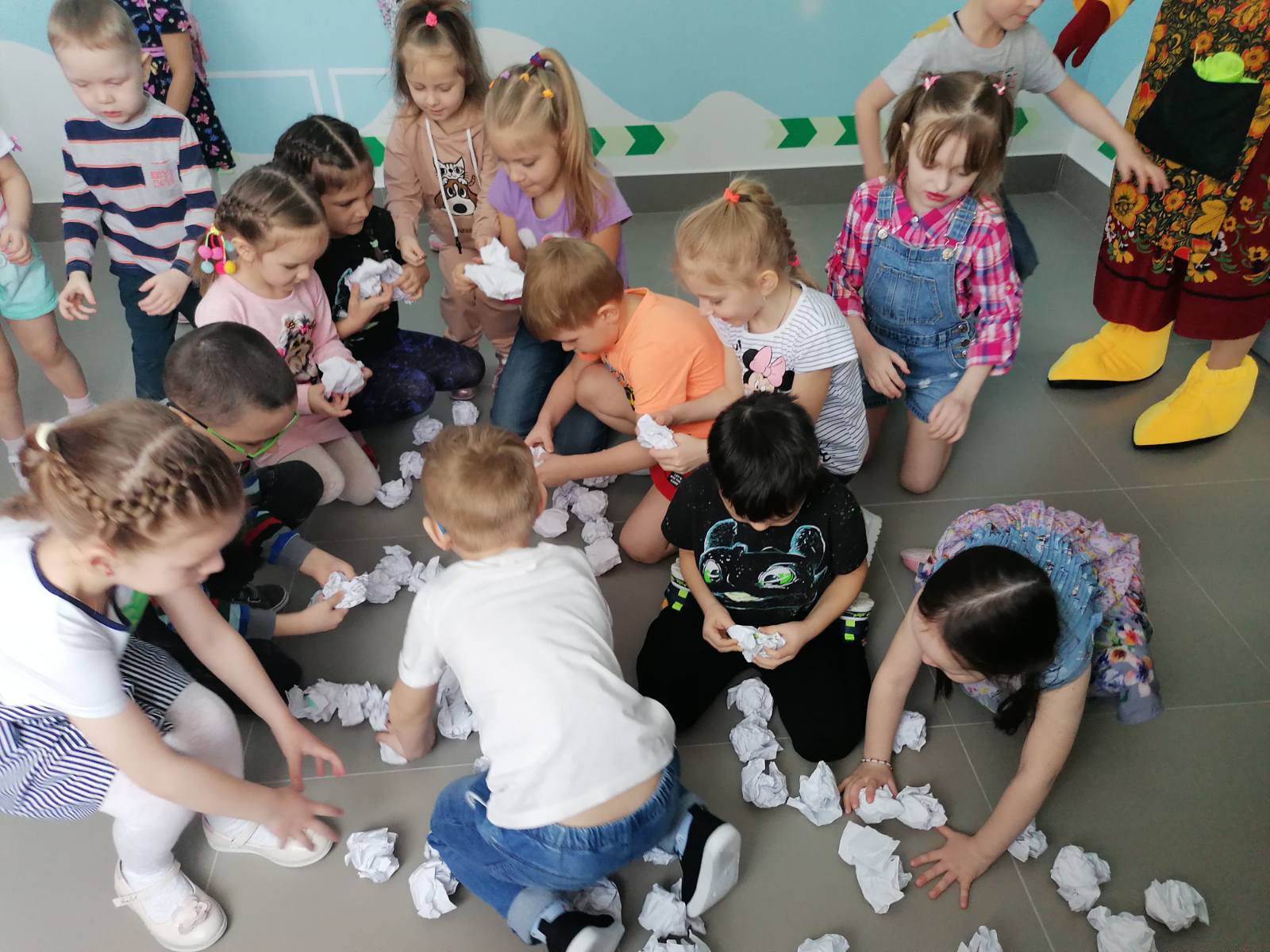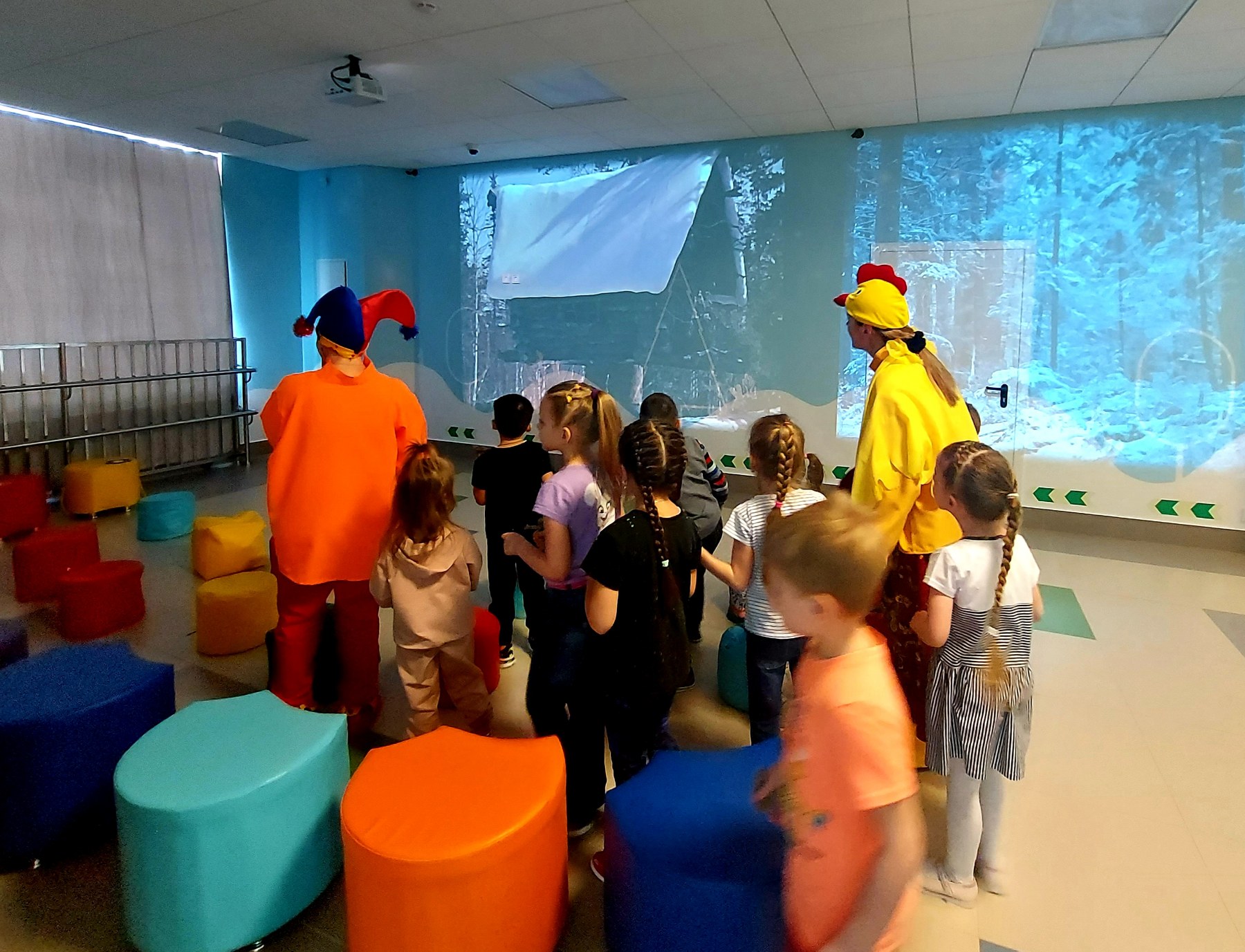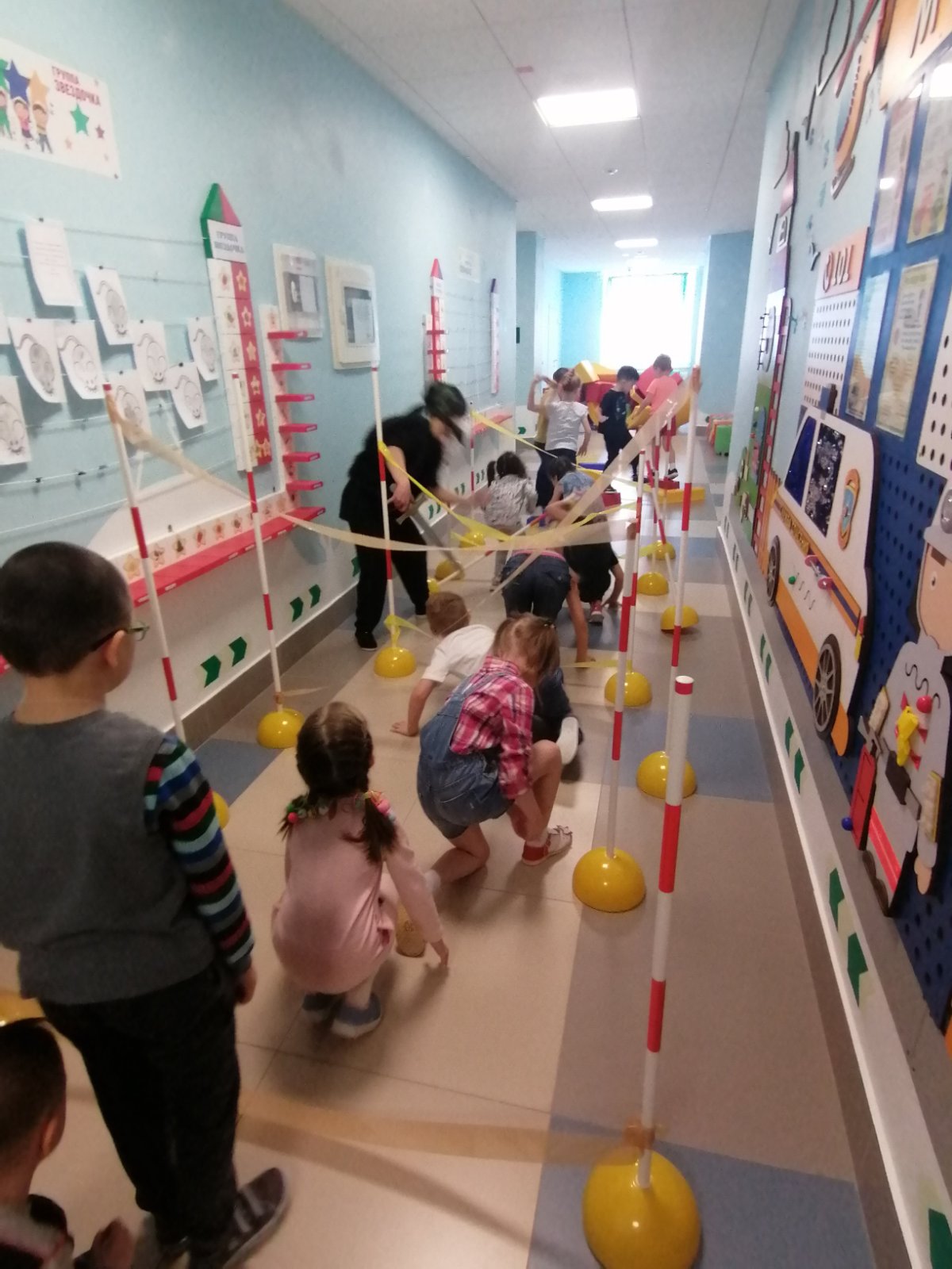 На начальном этапе было проведено обыгрывание ситуации: дети отгадывали загадки, собирали резные пазлы, участвовали в весёлой разминке и конечно соревновались в эстафетах с Разбойниками. Сказочные герои с удовольствием выполняли с ребятами все задания, в том числе и творческие.